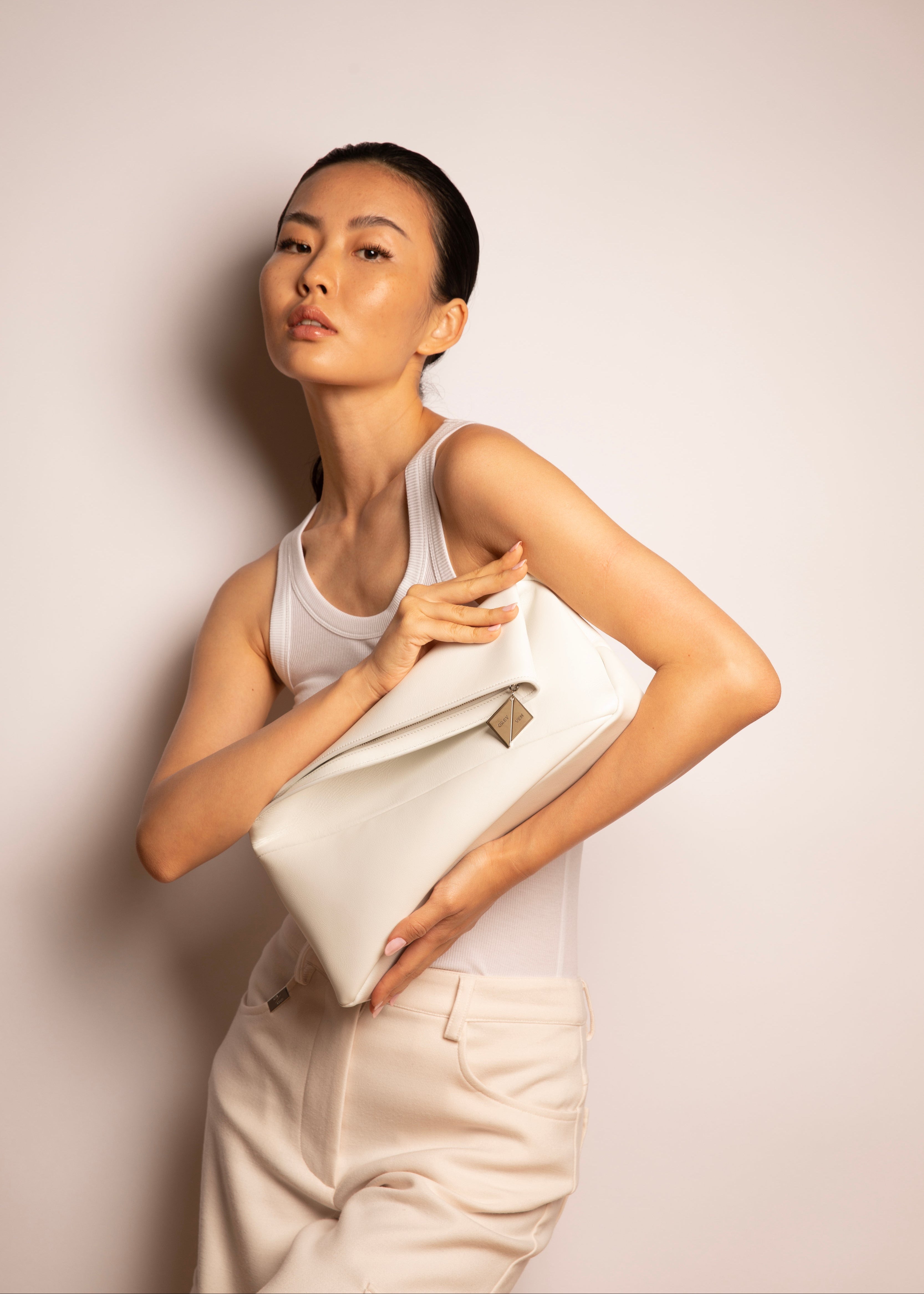 Colorways/Materials: This comes in gloss leather in black and white with a branded charm zipper pull - gold for black and palladium for white.